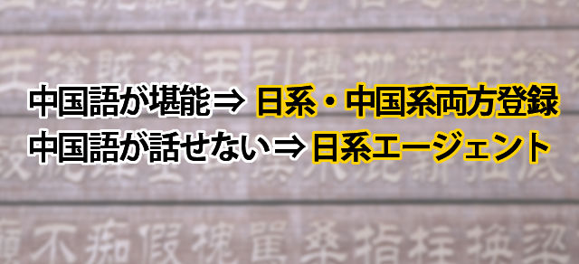 中国語が堪能な場合、日系・中国系両方から情報を入手するために両方登録しておくのが良いでしょう。中国語が話せない場合はやはり日系エージェントを中心に登録することになりますが、日本でも大手転職エージェントの多くは中国に進出していますので、それらを利用するのが良いでしょう。