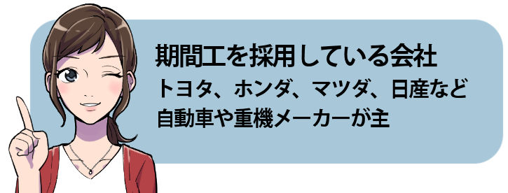 - 期間工を採用しているのは日本を代表する自動車や重機メーカー