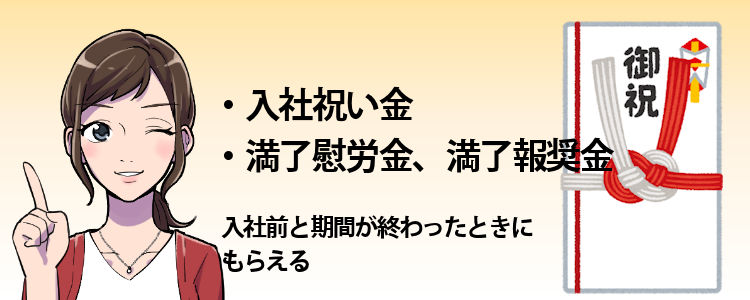 入社前と期間が終わったときに数万~数十万円(40万~50万)単位でお祝い金がもらえます。